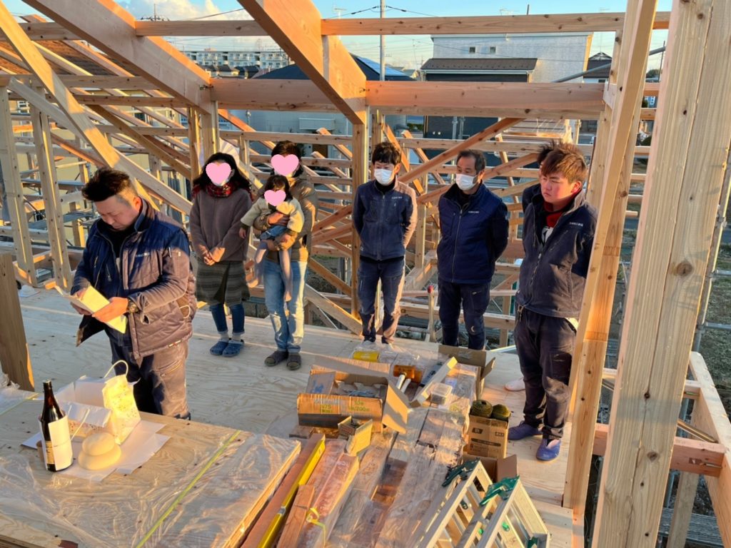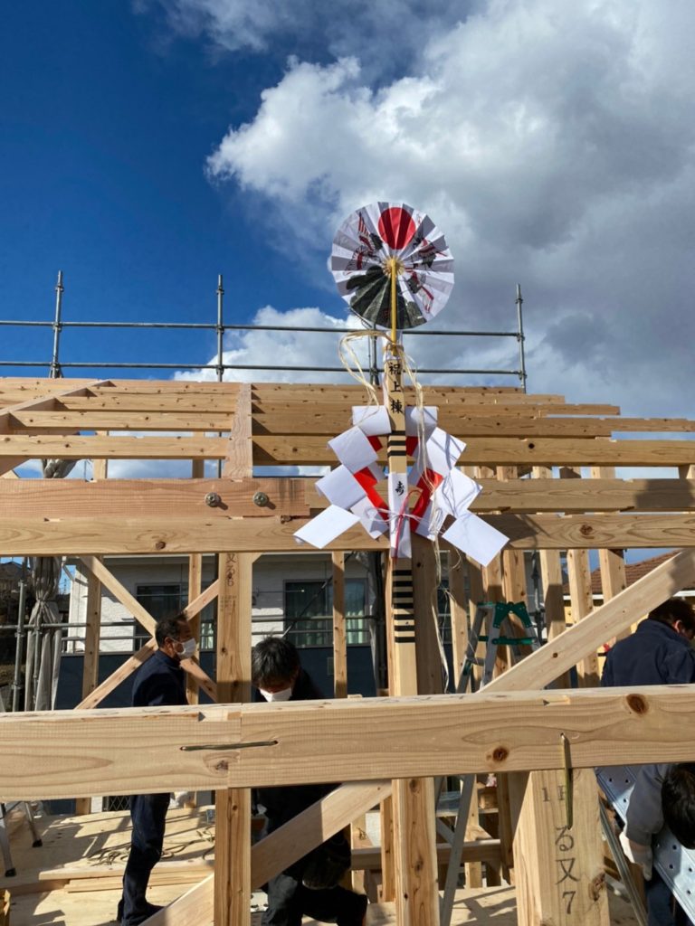 青空の下、気持ちのよい建て方日和となりました。材料が搬入され、どんどん組み上がって行きます☆