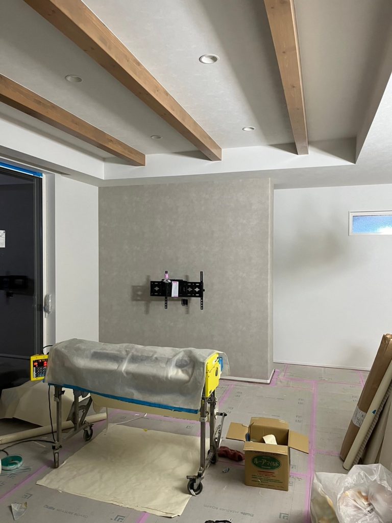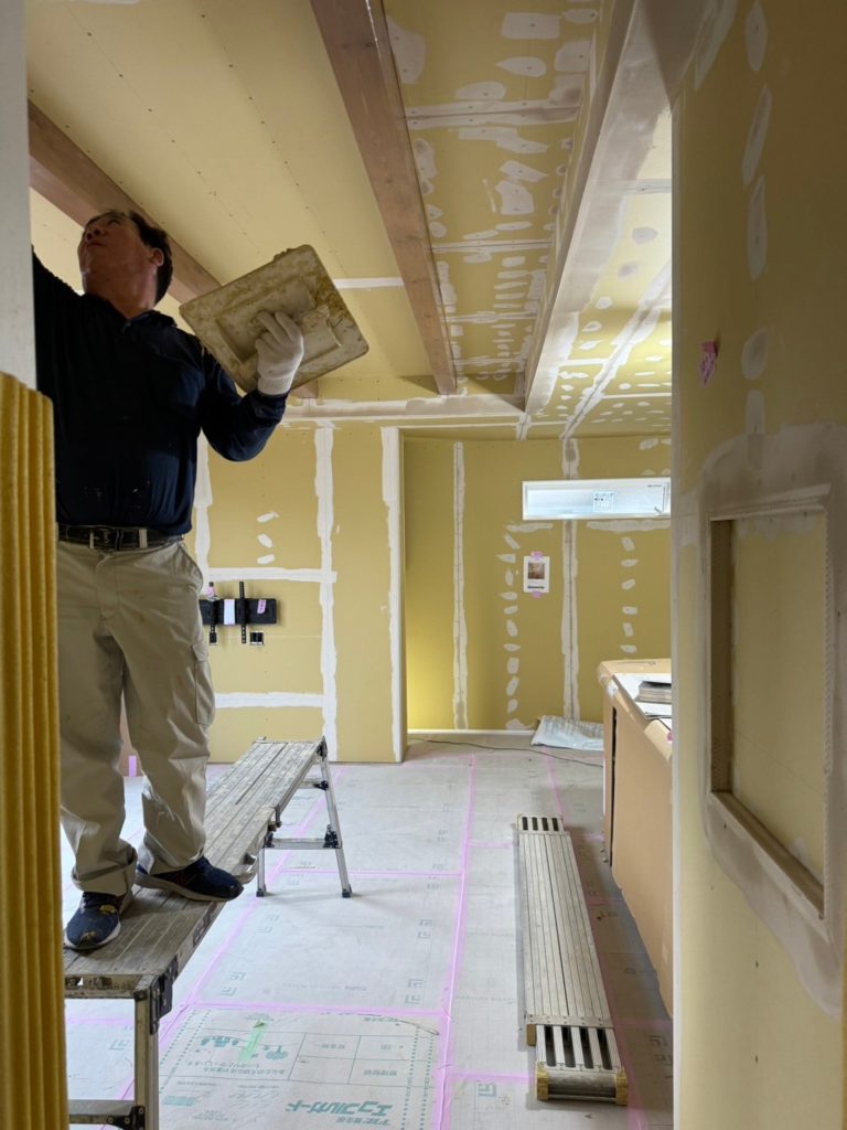 筑西市・A様邸新築工事⑪2024年4月1日 壁紙を貼る前に、石こうボードの継ぎ目やネジのくぼみなどの凹凸がなくなるように、パテ処理を行います。天井部分にも、しっかりとパテ処理が行われています。 カテゴリ:お知らせ/新着情報 進行中物件