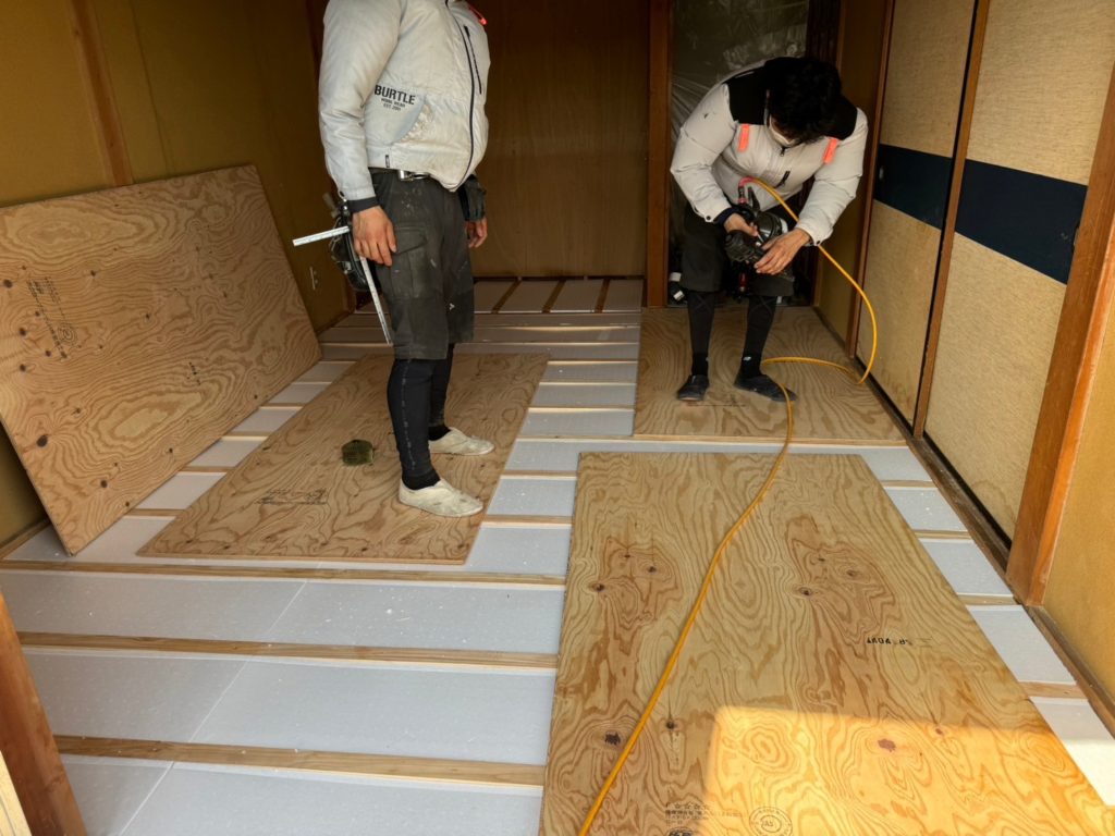 今回は、腐食などの傷みがあったため、下地の補修や断熱材の補充も行ってからフローリングを張りました。