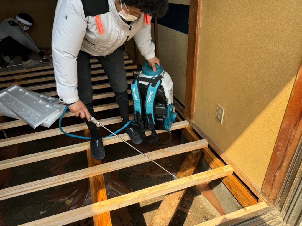 安心安全な木材保存剤の「エコボロン」を散布します。高濃度のホウ酸塩を木材の内部まで浸透させ、シロアリ・木材腐朽菌から木材を守ります。