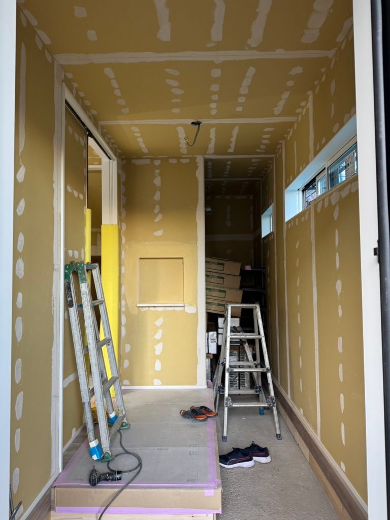 クロス貼りの工事に進みます。石膏ボードのネジのくぼみや継ぎ目等をパテを塗り平にします。