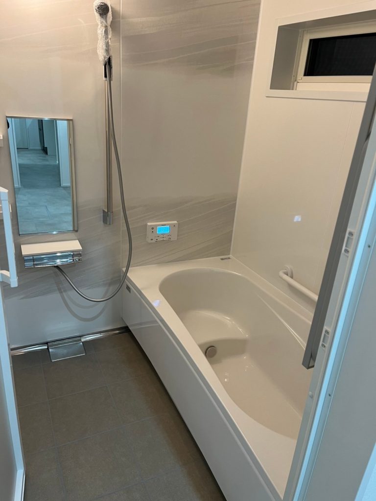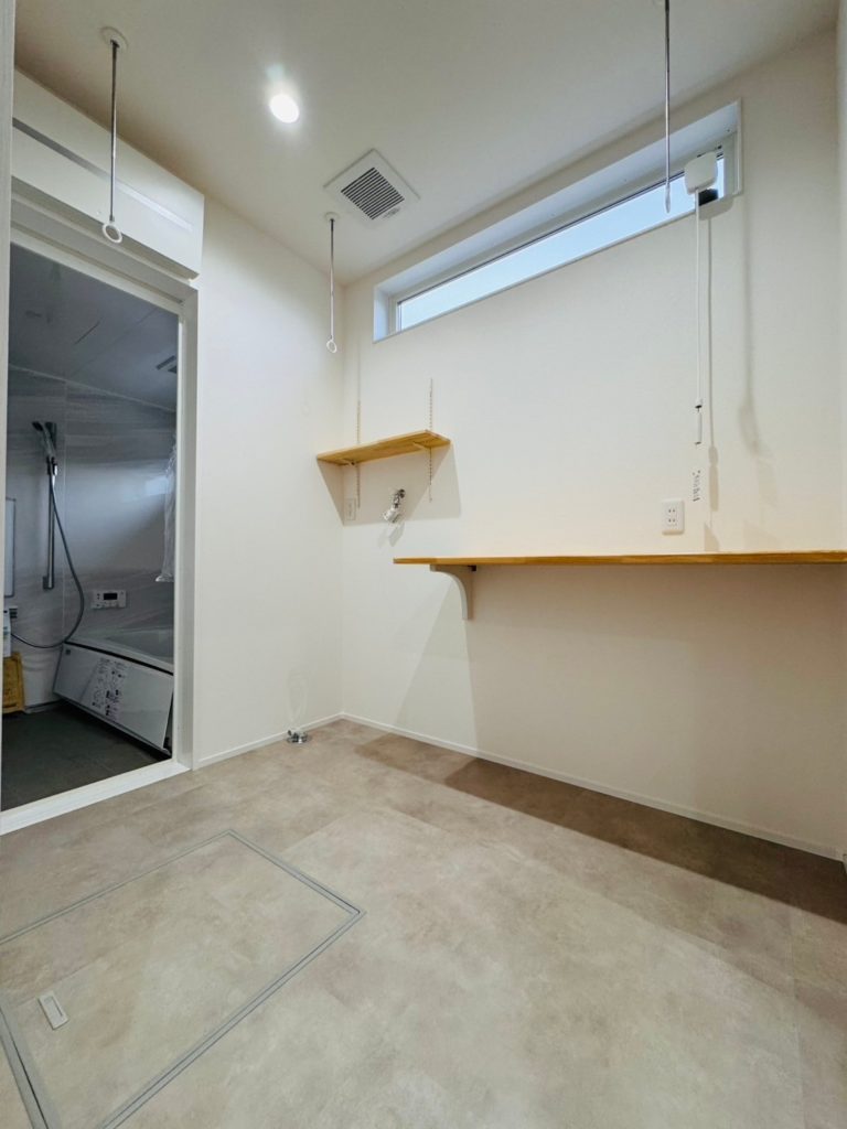 浴室の隣の脱衣室には、洗濯機が置けランドリールームも兼ねています。洗濯やアイロンをかけやすい棚も便利です。