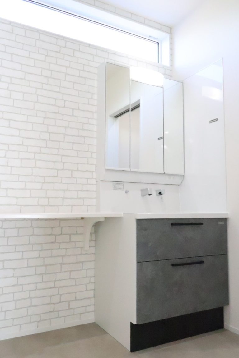 脱衣室洗面室です。同じ場所なのに、昼間の自然光と夜のライとで雰囲気が変わりますね♪。洗面台と同じ高さの棚があることで見た目もスッキリ、タオルや着替えもさっと取れて便利です。