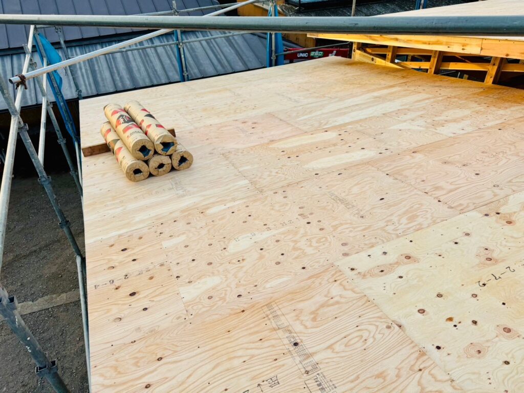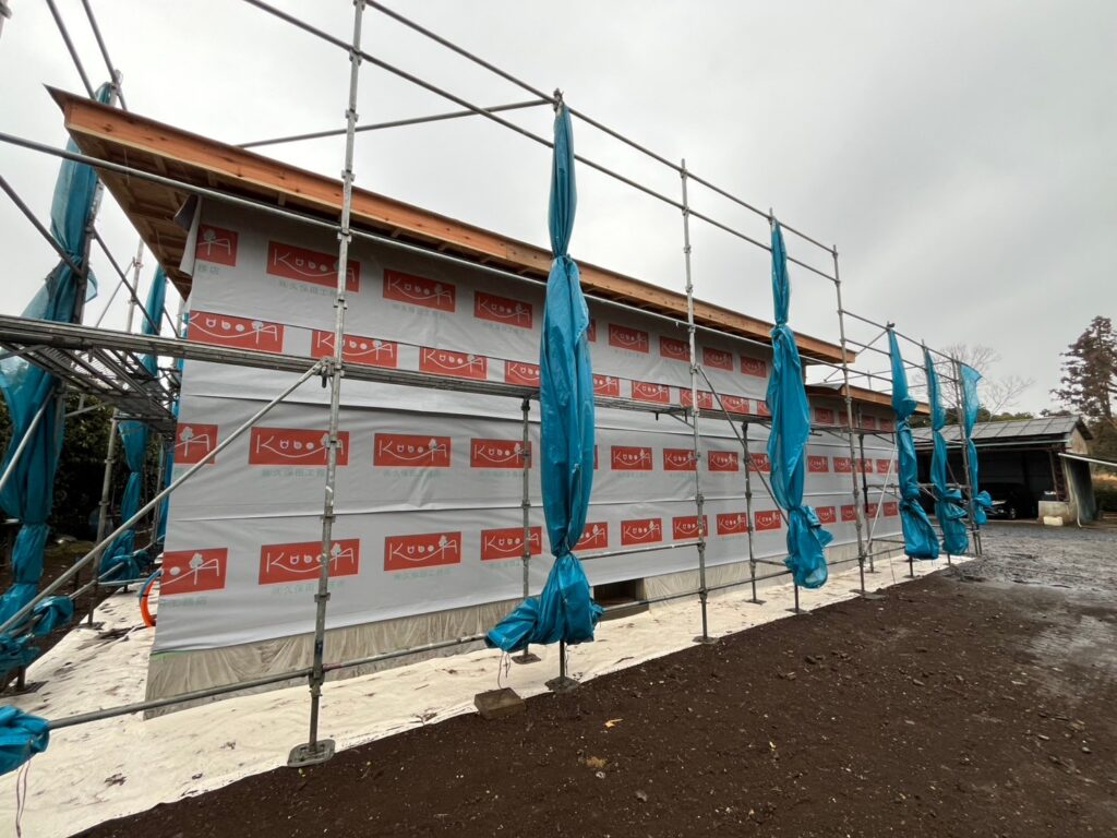 結城市・O様邸新築工事⑦2025年3月7日 外壁工事の準備として、防水シートが貼られます。 屋根材の下に防水シートのルーフィングを張ります。雨水を屋根下に入れず軒先へ流す重要な役割があります。 カテゴリ:お知らせ/新着情報 進行中物件