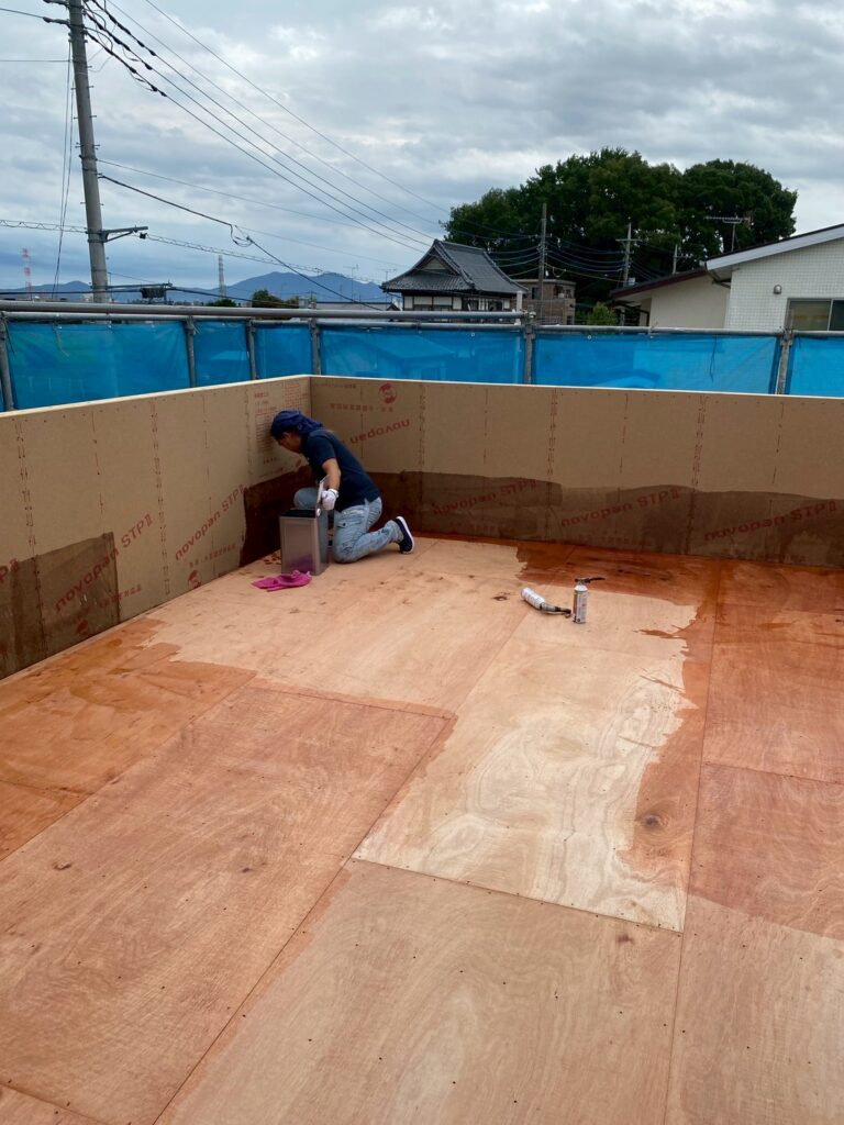しっかりと防水工事を進めます。職人さんの丁寧な作業が続きます。