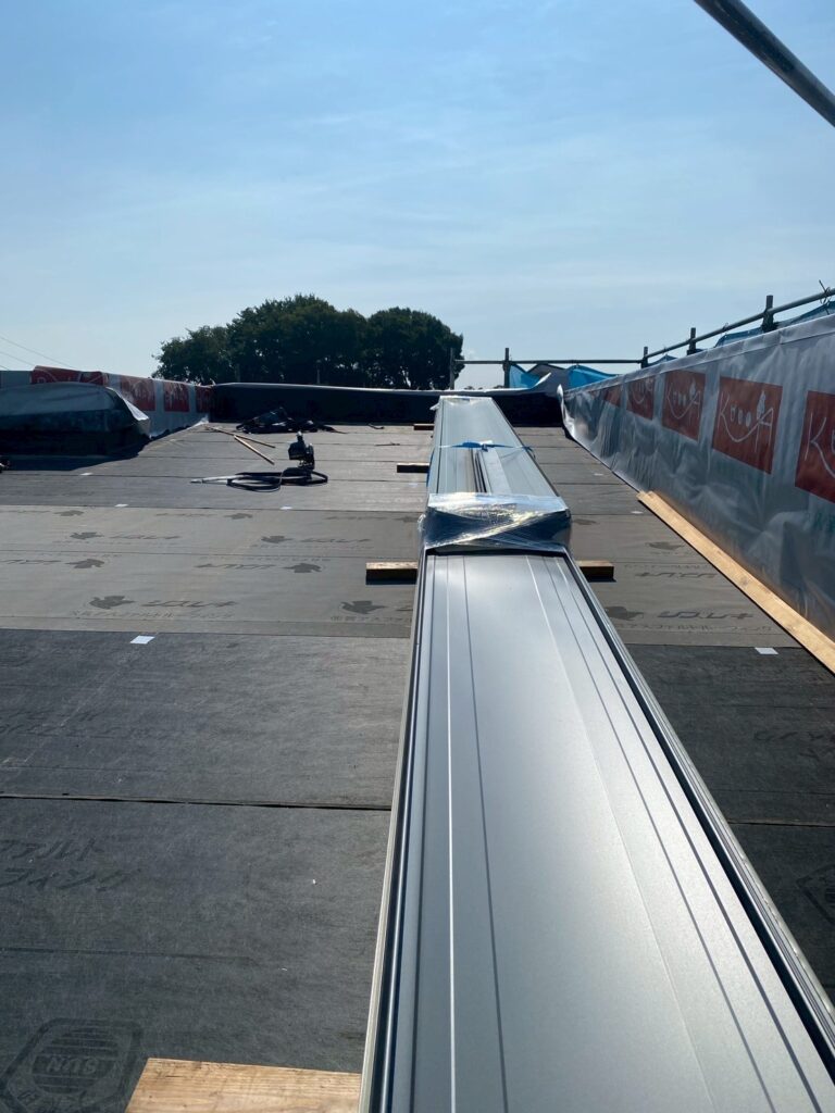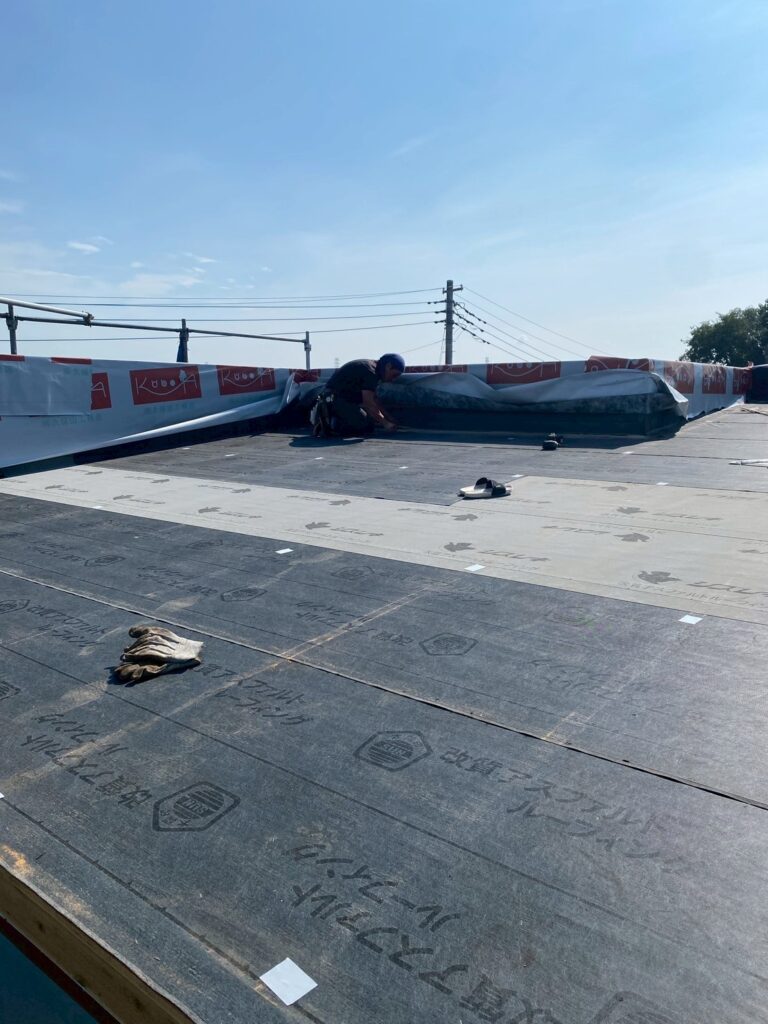 屋根には、防水シートを貼っていきます。アスファルトルーフィングは現在もっとも多くの住宅に使われている防水材です。