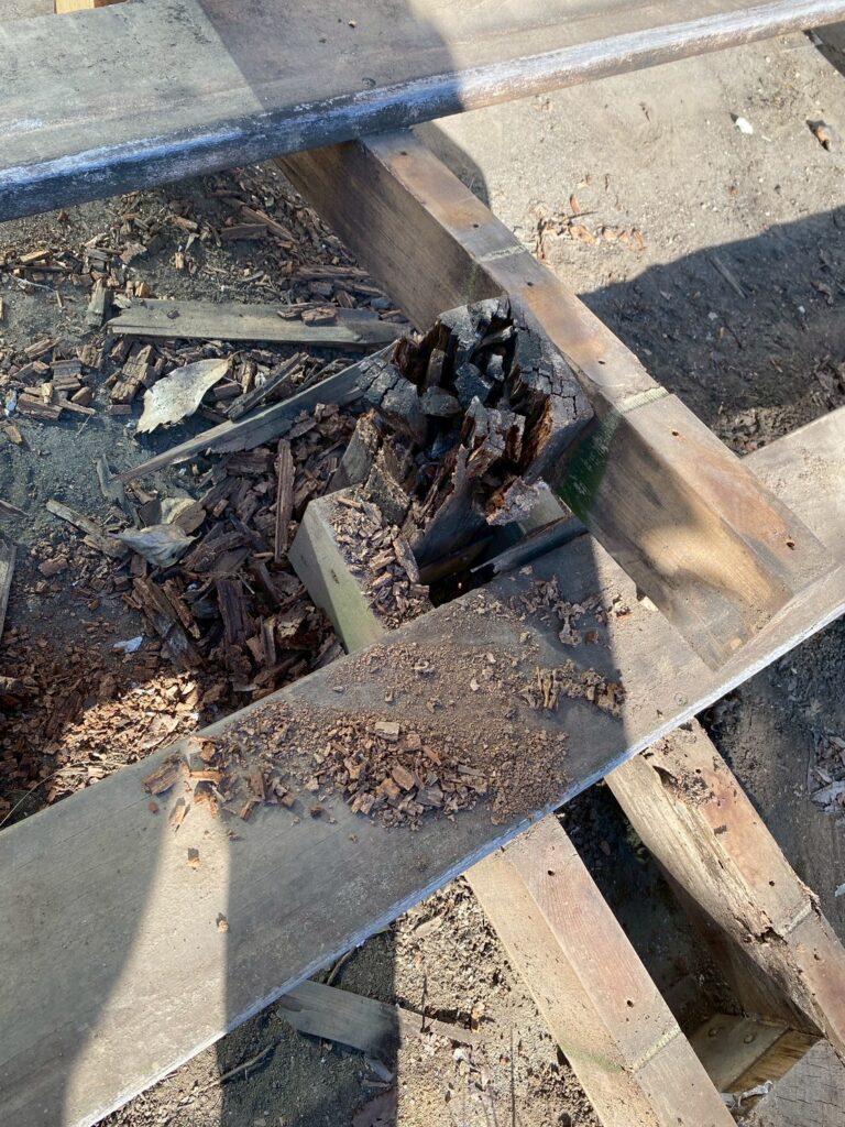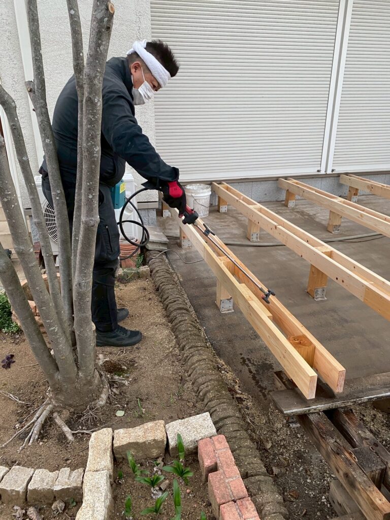 新しい柱にエコボロンを丁寧に塗布していきます。エコボロンは、ホウ酸塩を主原料とする木材保存剤です。防腐・防蟻(シロアリ)・防虫・カビ対策に効果があります。