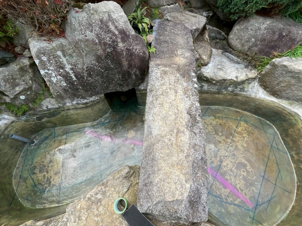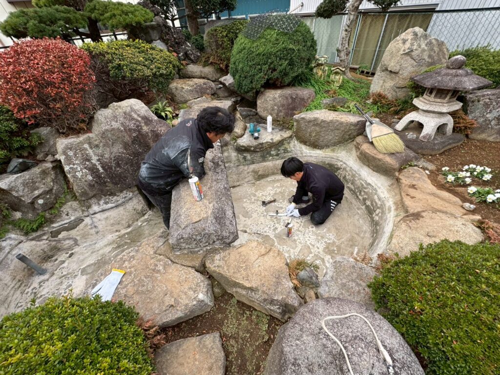 お庭の池の水漏れの修理のご依頼をいただきました