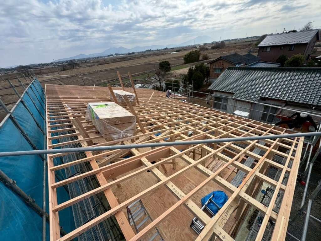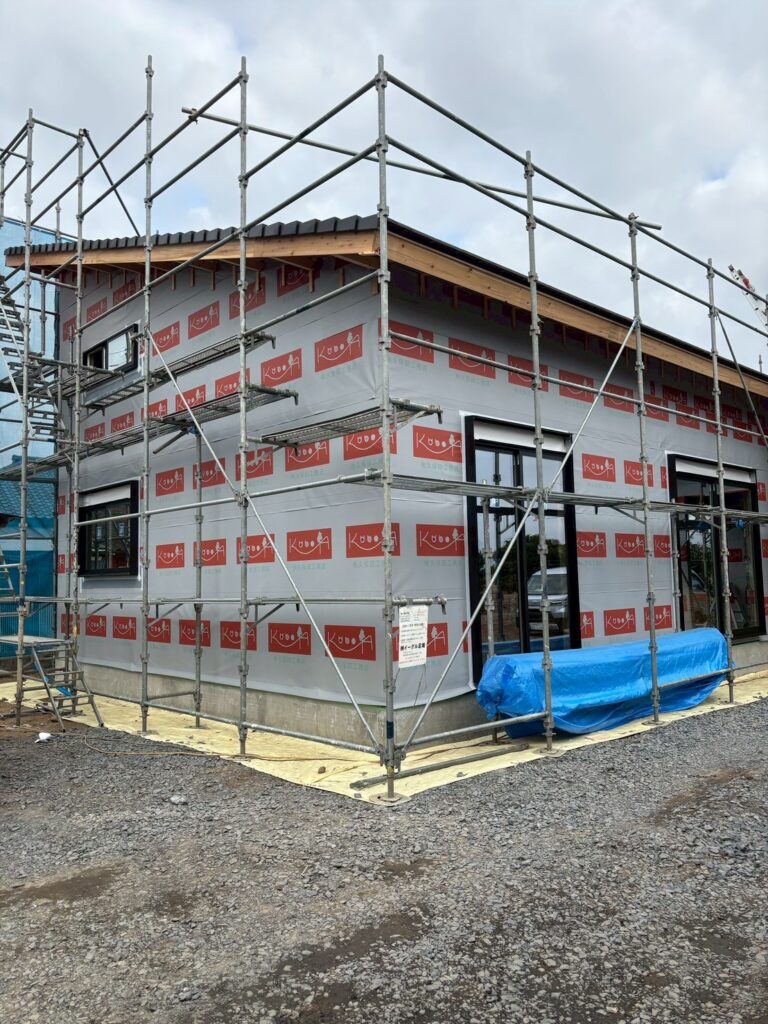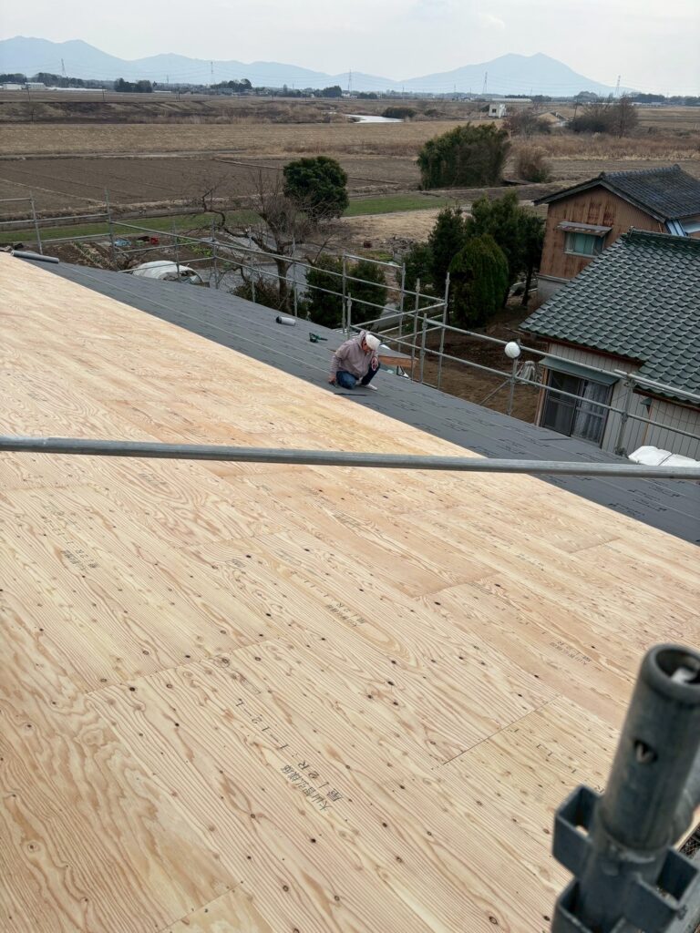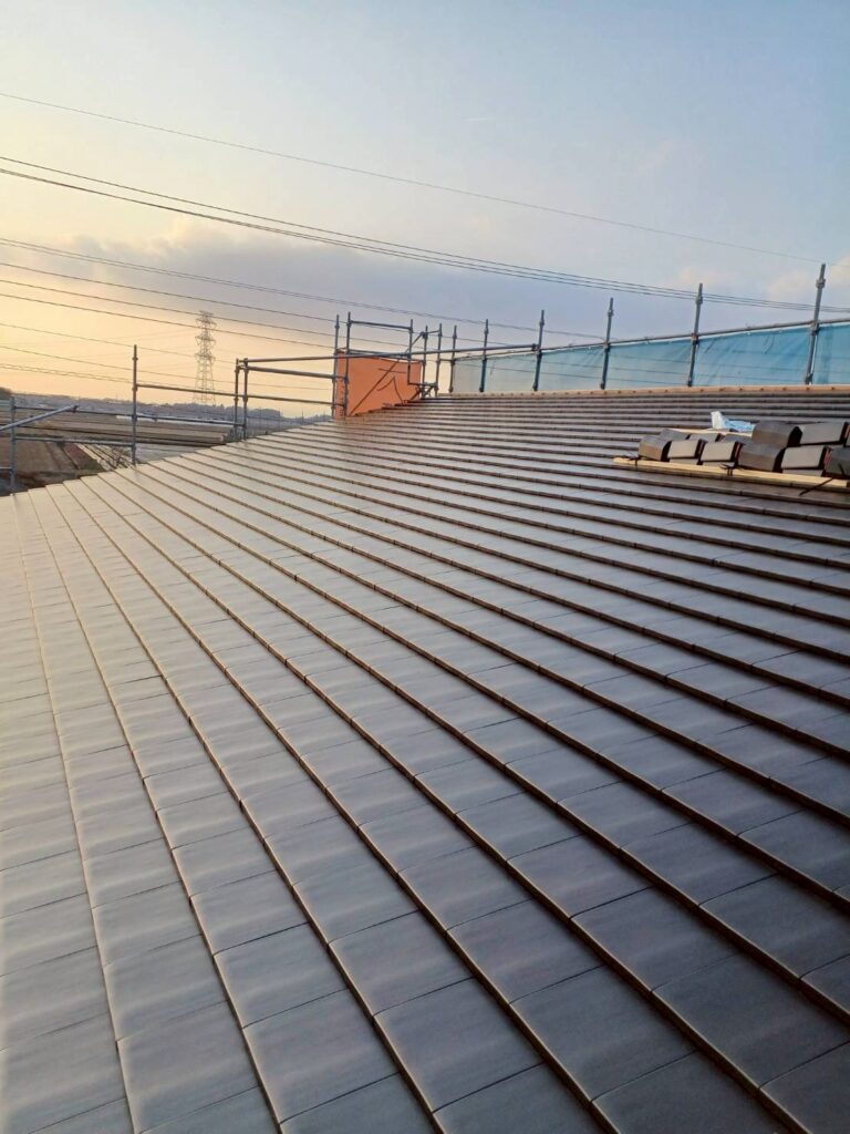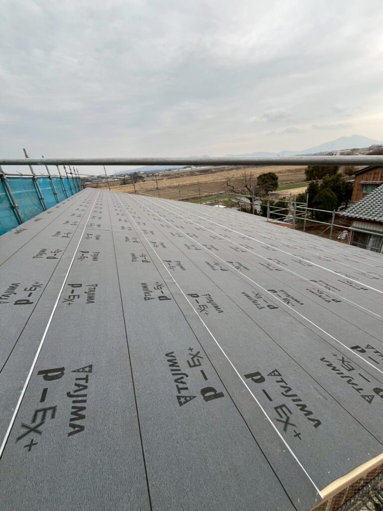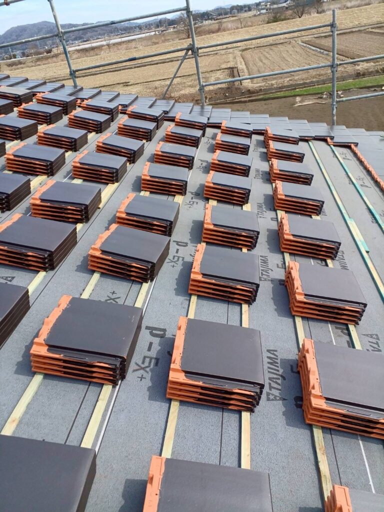 野地板の上に、雨漏りを防ぐための防水シートを隙間なく敷き詰めます。きれいに並べられた瓦が気持ちいいですね☆