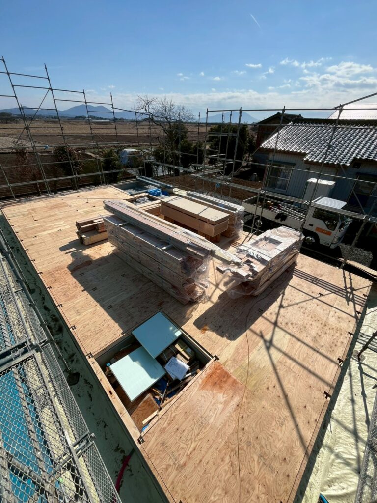 冬の澄んだ青空の下、建て方が進みます。クレーンや職人により、短時間で一気に組み上げられるため圧巻です […]