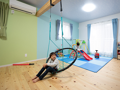 2階にもこだわりが詰まっています。子どもたちの成長に合わせ将来、間仕切りできる子ども部屋。屋内で遊べるブランコも設置しました。