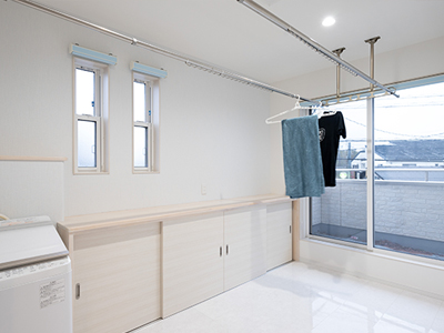 洗濯と室内干し、乾いた洗濯物をたたんで収納するまでが、この場所で完結します。妻の背の高さに合わせてカスタマイズされているのもありがたいです。ポカポカと陽当たりが良いので、ただのんびり過ごす場所としても最高です。